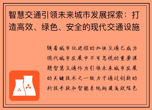 智慧交通引领未来城市发展探索:打造高效、绿色、安全的现代交通设施体系